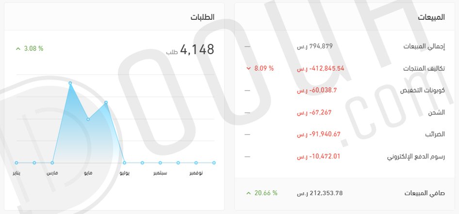 إجمالي المبيعات 794,879 ريال، 4,148 طلب، صافي المبيعات 212,353 ريال بعد خصم التكاليف والضرائب.