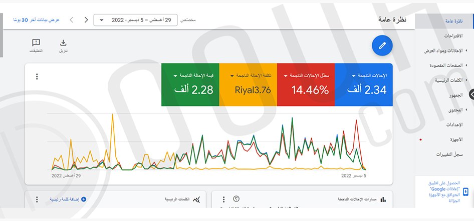 عدد مرات الظهور 23.3 ألف، النقرات 3.96 ألف، نسبة النقر إلى الظهور 17.02%، متوسط تكلفة النقرة 1.08 ريال.