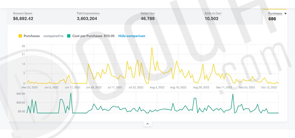 إجمالي الإنفاق 6,892$، تم الوصول إلى 3,603,204 ظهور مدفوع، 46,789 swipe ups، و686 عملية شراء.